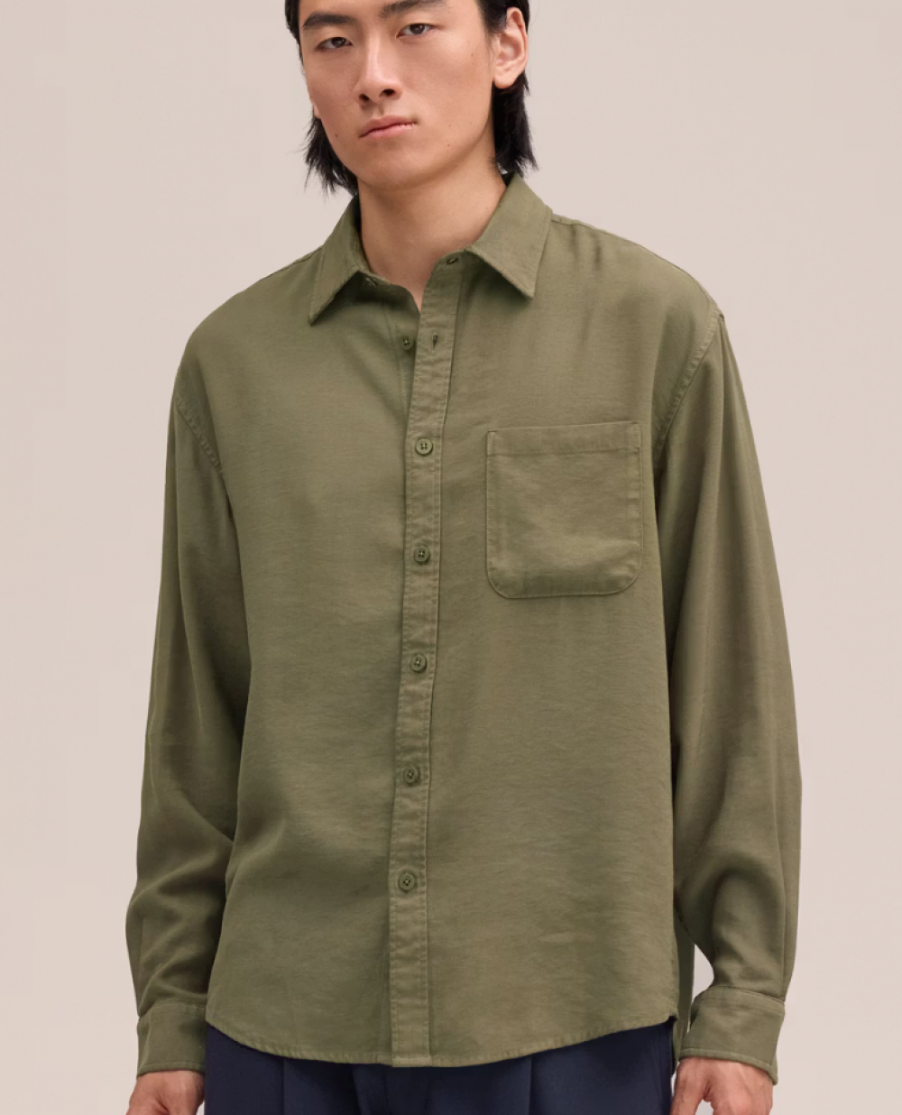 Cette chemise mi-lourde est réalisée en sergé de viscose LENZING™ ECOVERO™, souple et fluide pour un confort optimal. Elle se distingue par sa large patte de boutonnage, son ourlet arrondi et ses épaules légèrement tombantes, offrant une silhouette détendue et élégante à la fois.