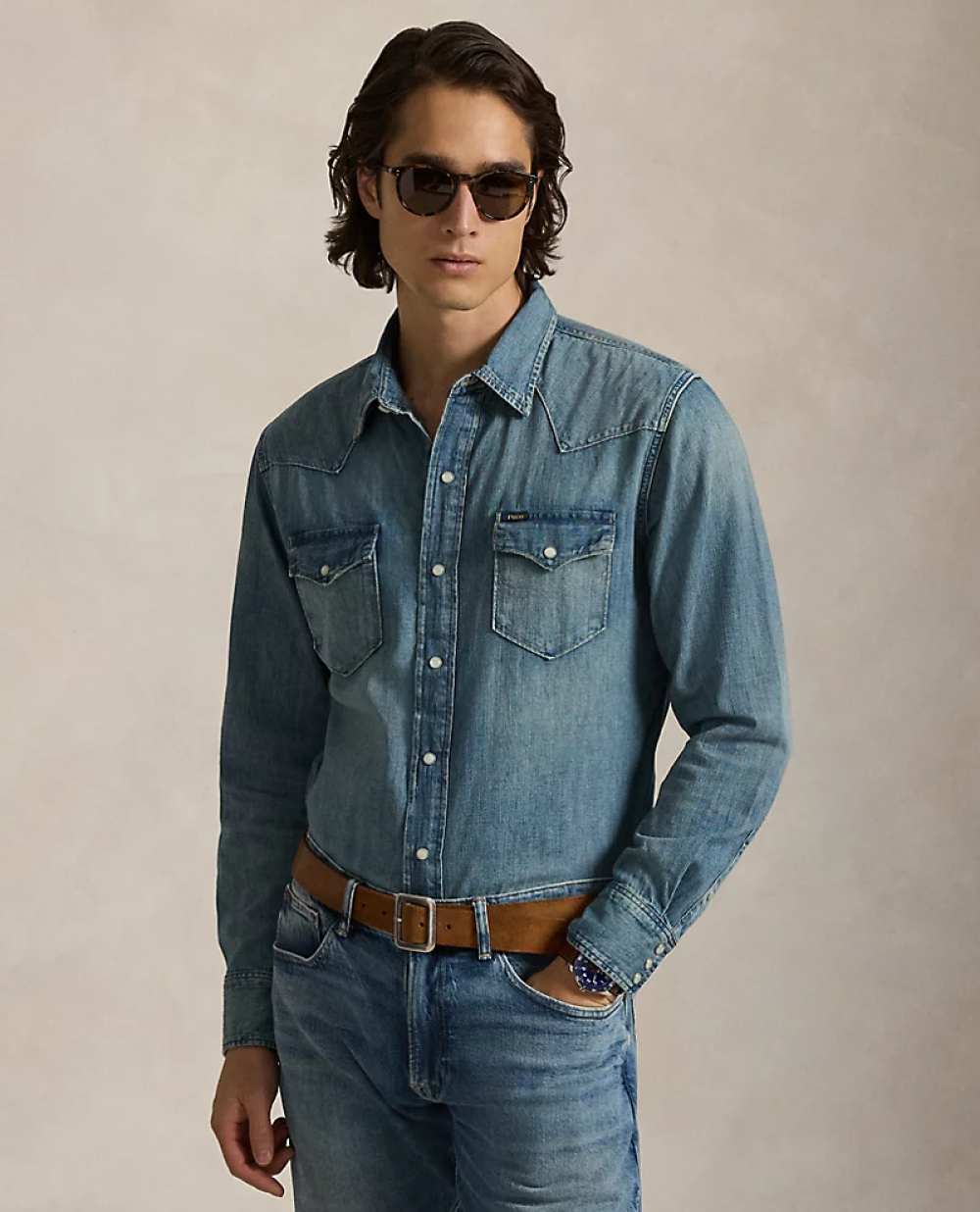 L’emblématique chemise western, de la marque, à la coupe ample est confectionnée en denim de coton léger, puis traitée pour offrir un effet patiné, comme usé par le temps. Une pièce iconique au caractère affirmé, entre héritage vintage et confort contemporain.