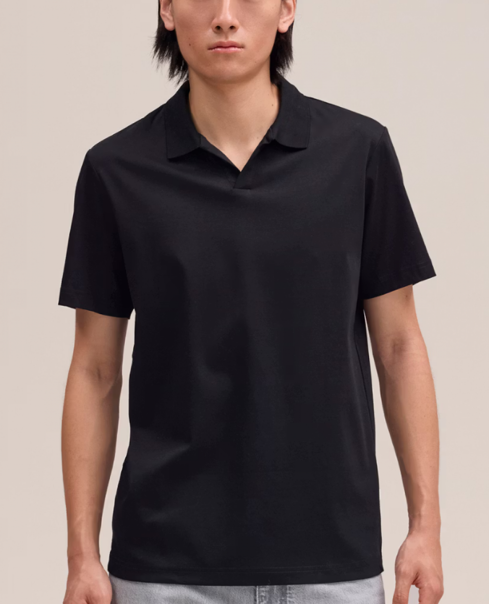 Ce polo à col ouvert est confectionné en jersey interlock de coton biologique lisse, offrant un toucher doux et luxueux. Il se distingue par ses finitions soignées, comprenant un col plat tricoté et des coutures à double aiguille, alliant confort et élégance intemporelle