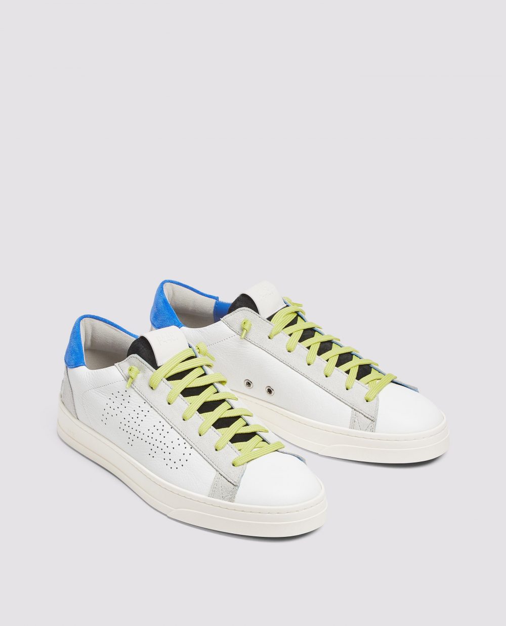 La Jack Neon Blue affiche un style audacieux et contemporain. Confectionnée en cuir blanc et en daim premium, elle se distingue par une languette et un contrefort en daim noir qui soulignent son contraste raffiné. Des lacets verts éclatants et la semelle en caoutchouc signature P448 viennent parfaire ce look unique, à la fois urbain et sophistiqué.
